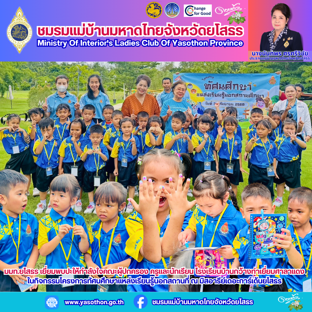 วันที่ 30 กันยายน 2568 เวลา 12.00 น. นางนันทพร ศรศรีวิชัย ประธานแม่บ้านมหาดไทยจังหวัดยโสธร พร้อมด้วย นางเพชรรวง พวงแก้ว ผู้ช่วยนายกเหล่ากาชาดจังหวัดยโสธร เยี่ยมพบปะให้กำลังใจคณะผู้ปกครอง ครูและนักเรียน โรงเรียนบ้านกว้างท่าเยี่ยมศาลาแดง ในกิจกรรมโครงการทัศนศึกษาแหล่งเรียนรู้นอกสถานที่ ณ มิสอารีย์เดอะการ์เด้น อำเภอเมืองยโสธร จังหวัดยโสธร ซึ่งเปิดเป็นพื้นที่สร้างสรรค์สำหรับครอบครัวทุกช่วงวัยในชุมชน เป็นสถานที่จัดกิจกรรมกิจกรรมสนุก ๆ ที่จะทำให้วันหยุดของครอบครัวอบอุ่นยิ่งขึ้น โดยมิสอารีย์เดอะการ์เด้น ได้สร้างสรรค์พื้นที่โดยรอบ ให้เป็นพื้นที่สำหรับปลอดภัย ปล่อยให้เขาได้เป็นเด็ก… ความสุขของวัยเด็กนั้นไม่ได้ซับซ้อน แค่มีพื้นที่ให้วิ่งเล่น มีเสียงหัวเราะให้ได้ปลดปล่อย แค่นั้นก็พอแล้ว ที่มิสอารีย์ เดอะ การ์เด้น ซึ่งได้ออกแบบที่นี้ให้เป็นสนามเด็กเล่นธรรมชาติที่ปลอดภัย มีบ้านต้นไม้ให้ปีน มีชิงช้าให้แกว่ง มีสนามหญ้ากว้างๆ ให้กลิ้งเล่น ได้เหยียบทราย ให้เป็นโลกใบใหญ่ที่เต็มไปด้วยจินตนาการ ให้เด็กๆ ได้เป็นเด็กอย่างเต็มที่ ได้เลอะ ได้ลุย ได้เรียนรู้ ได้จดจำ ได้เปิดจินตนาการ และยังมีพื้นที่สีเขียวให้ผู้ใหญ่ได้นั่งพัก จิบกาแฟ ทานอาหาร เฝ้ามองเด็กๆ เติบโตไปพร้อมกับรอยยิ้มที่สดใส เพราะเราเชื่อว่าทุกเสียงหัวเราะ ทุกฝีเท้าที่วิ่งเล่น ล้วนเป็นบทเรียนสำคัญของชีวิต ปล่อยให้เขาได้เป็นเด็ก ที่ มิสอารีย์ เดอะ การ์เด้น – พื้นที่ปลอดภัยสำหรับทุกวัย และทุกหัวใจ