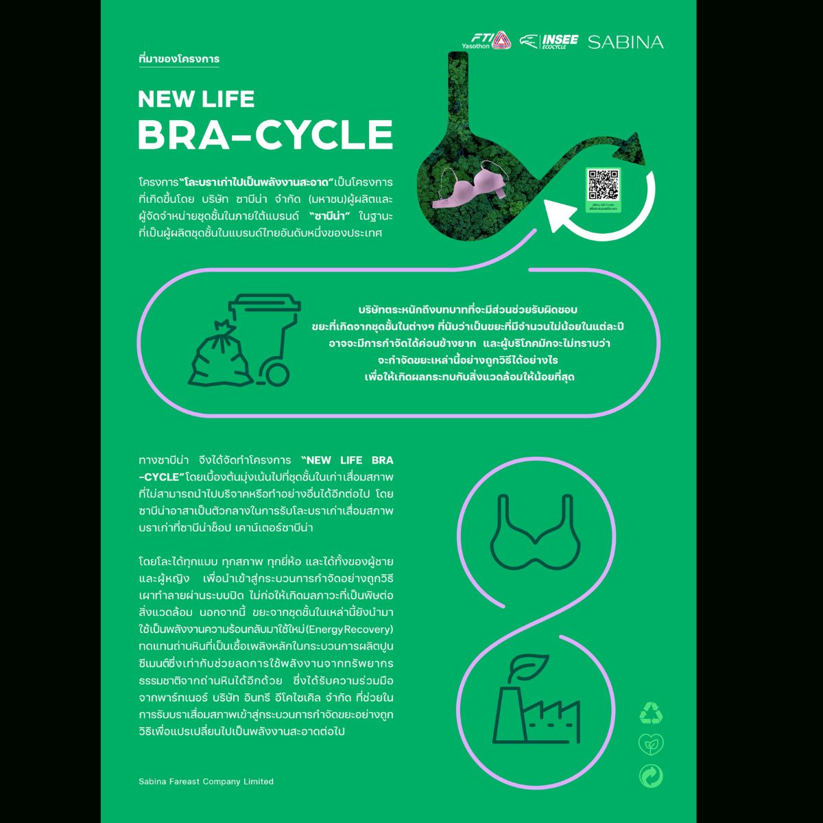 นายชาญชัย ศรศรีวิชัย ผู้ว่าราชการจังหวัดยโสธร กล่าวว่า “โครงการนี้ถือเป็นมิติใหม่ในการจัดการขยะของจังหวัดยโสธร ที่ไม่ได้มองแค่ขยะทั่วไป แต่ลงลึกไปถึงขยะกำจัดยากอย่างชุดชั้นใน ซึ่งปกติแล้วประชาชนอาจไม่ทราบว่าจะจัดการอย่างไรให้ถูกวิธี การนำขยะเหล่านี้มาเปลี่ยนเป็นพลังงานสะอาดไม่เพียงแต่จะช่วยลดปริมาณขยะฝังกลบ แต่ยังสอดคล้องกับนโยบายการพัฒนาจังหวัดที่มุ่งเน้นความเป็นมิตรต่อสิ่งแวดล้อมอีกด้วย ซึ่งโครงการ “NEW LIFE BRA-CYCLE” เกิดขึ้นจากความตระหนักถึงปัญหาขยะจากชุดชั้นในที่เสื่อมสภาพ ซึ่งเป็นขยะสิ่งทอที่กำจัดได้ยากและมีปริมาณเพิ่มขึ้นทุกปี โดยเสื้อผ้าที่ถูกทิ้งจำนวนมากมักจบลงด้วยการฝังกลบและบริษัท ซาบีน่า จำกัด (มหาชน) ได้ริเริ่มโครงการนี้ขึ้นมา เพื่อเป็นตัวกลางในการรวบรวมชุดชั้นในเก่า เสื่อมสภาพ ทุกยี่ห้อ ทุกรูปแบบ และจากทุกเพศ เพื่อนำไปกำจัดอย่างถูกวิธี โดยตลอดหลายปีที่ผ่านมาโครงการประสบความสำเร็จในการกำจัดบราเก่าไปแล้วกว่าหลายสิบตัน ซึ่งชุดชั้นในที่ได้รับบริจาคจะถูกส่งต่อไปยัง บริษัท อินทรี อีโคไซเคิล จำกัด เพื่อนำเข้าสู่กระบวนการเผาร่วม (Co-processing) ในเตาเผาปูนซีเมนต์ที่มีอุณหภูมิสูง ซึ่งกระบวนการนี้จะสามารถทำลายขยะได้อย่างสมบูรณ์โดยไม่ก่อให้เกิดมลพิษ และที่สำคัญคือ ความร้อนที่ได้จากกระบวนการเผาไหม้จะถูกนำกลับมาใช้เป็นพลังงานทดแทนเชื้อเพลิงถ่านหินในการผลิตปูนซีเมนต์ ซึ่งเท่ากับเป็นการลดการใช้ทรัพยากรธรรมชาติและลดการปล่อยก๊าซเรือนกระจกไปพร้อมกัน จึงกลายเป็นแนวทางการจัดการขยะแบบ Zero Waste to Landfill หรือการไม่ทิ้งขยะสู่หลุมฝังกลบอย่างแท้จริง