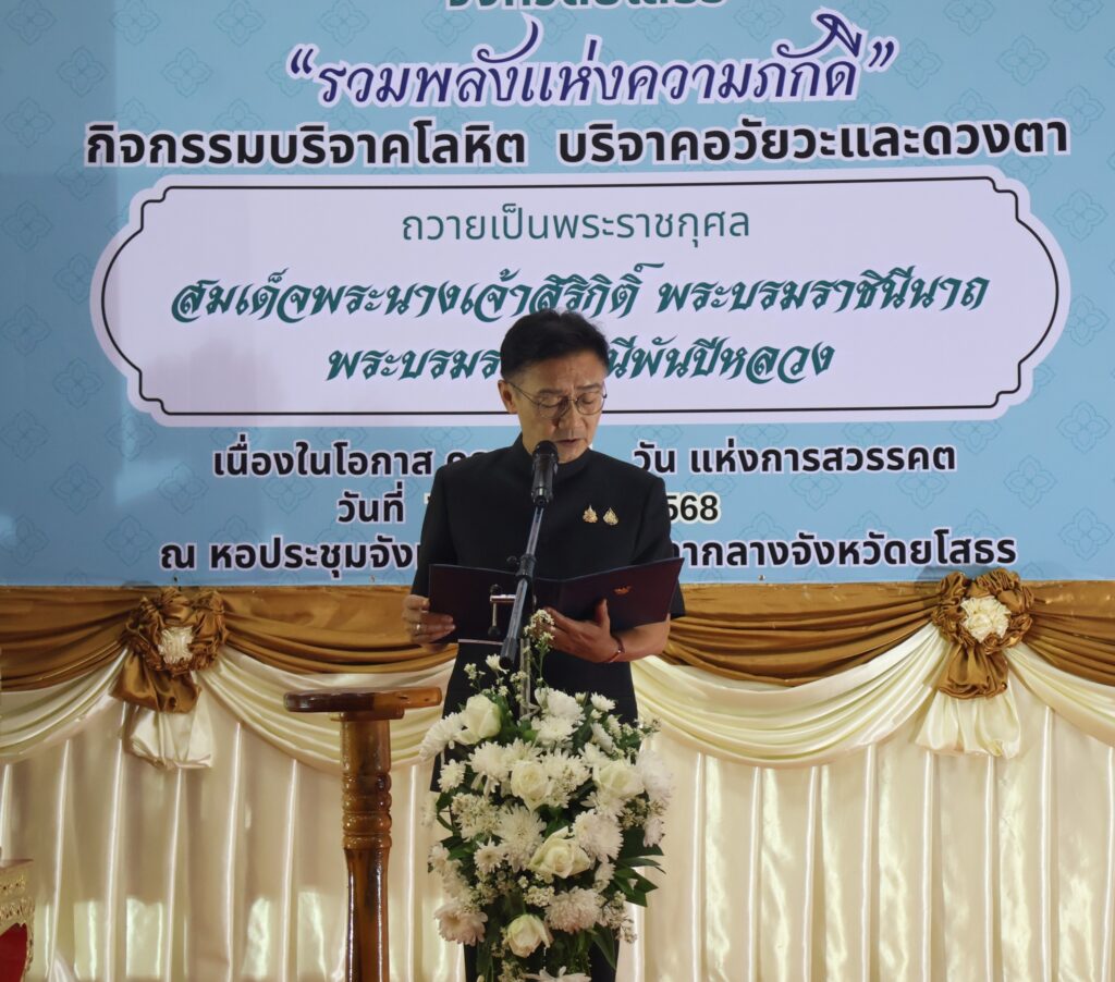 จึงขอเชิญชวนพี่น้องชาวยโสธรร่วมแสดงออกถึงความจงรักภักดีและน้อมรำลึกในพระมหากรุณาธิคุณ ด้วยการร่วมบริจาคโลหิต และแจ้งความจำนงในการบริจาคอวัยวะและดวงตา เพื่อเป็นพลังแห่งกุศล เพื่อน้อมถวายเป็นพระราชกุศลแด่สมเด็จพระนางเจ้าสิริกิติ์ พระบรมราชินีนาถ พระบรมราชชนนีพันปีหลวง ในวันที่ 7 พฤศจิกายน 2568 วันที่ 12 ธันวาคม 2568 และวันที่ 31 มกราคม 2569 ตั้งแต่เวลา 09.30 – 15.00 น. ณ หอประชุมจังหวัดยโสธร ศาลากลางจังหวัดยโสธร