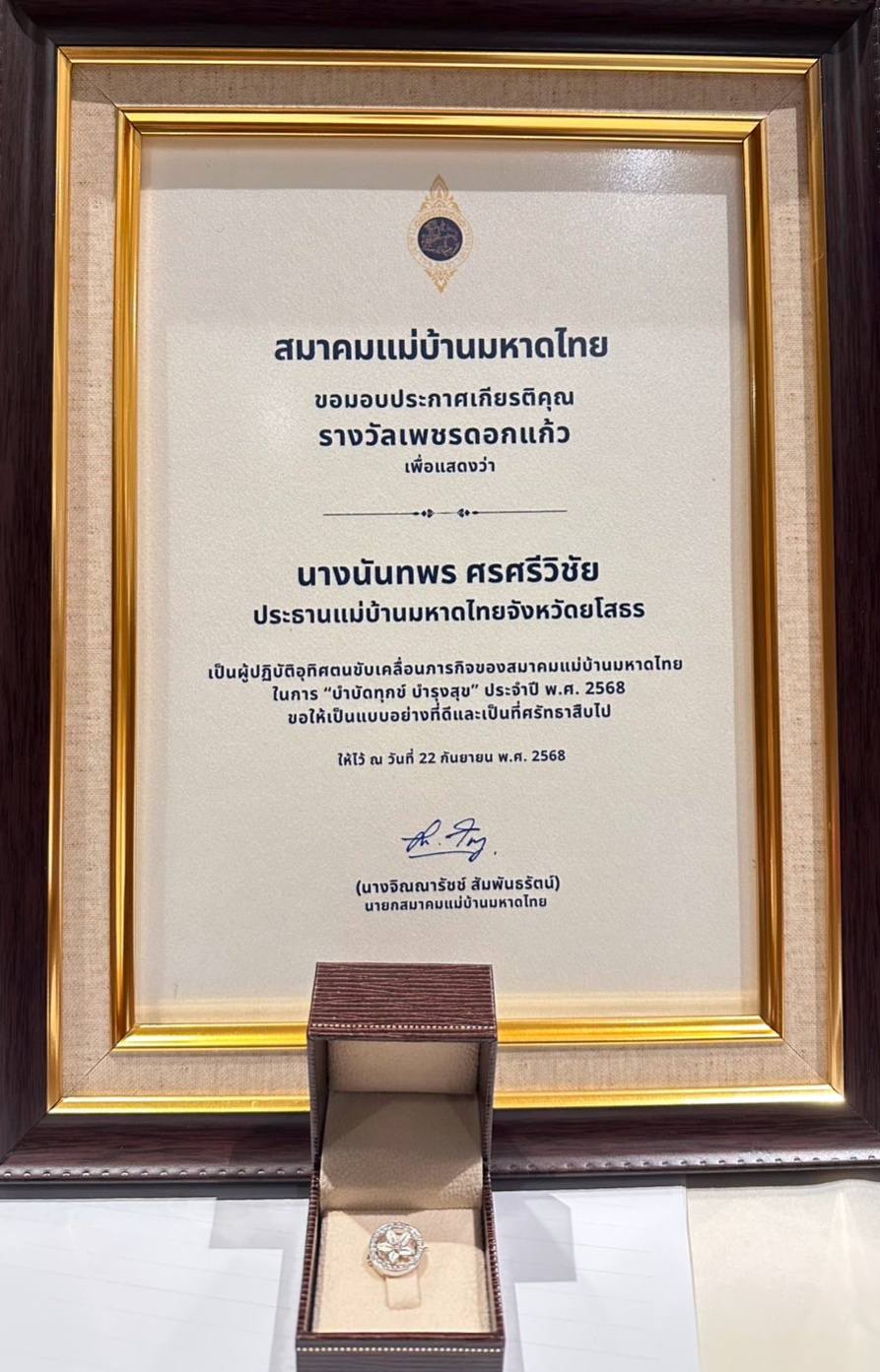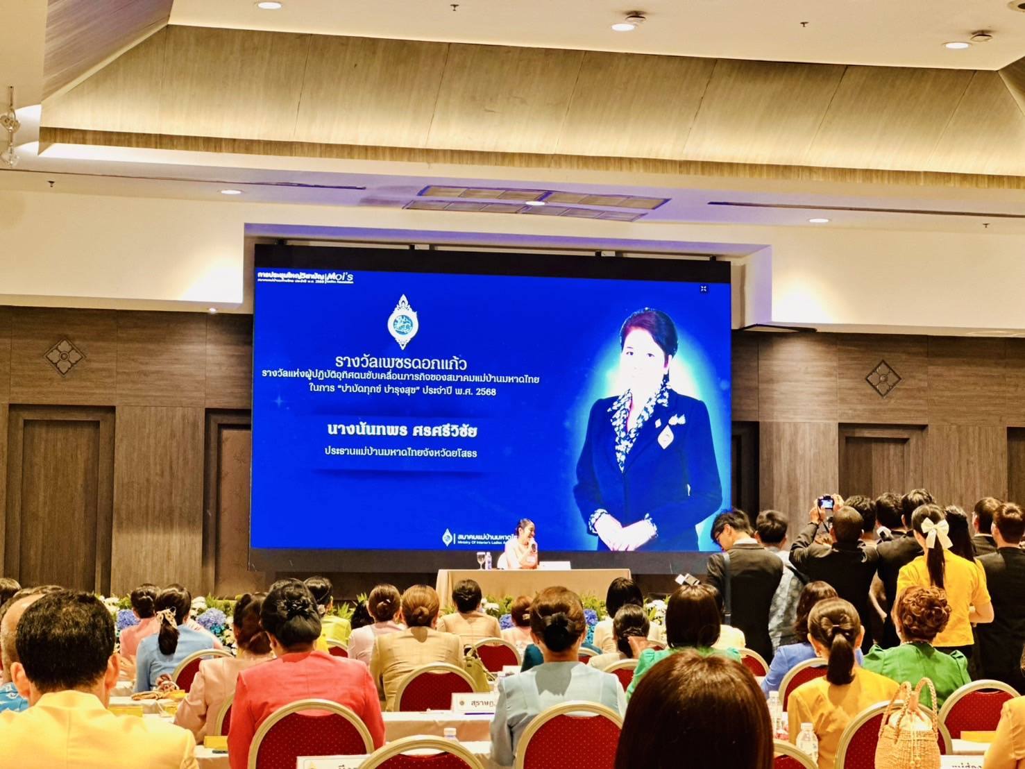 🎉🎉โดยท่านเป็น 1 ใน 10 ผู้ได้รับรางวัลจากทั่วประเทศ ซึ่งได้รับเกียรติจาก นางจิณณารัตน์ สัมพันธรัตน์ นายกสมาคมแม่บ้านมหาดไทย เป็นผู้มอบรางวัล ภายในงานประชุมใหญ่วิสามัญสมาคมแม่บ้านมหาดไทย ประจำปี พ.ศ. 2568 วันที่ 22 กันยายน 2568 ณ ห้องประชุมแซฟไฟร์ 204 อาคารอิมแพ็คฟอรั่ม ศูนย์แสดงสินค้าและการประชุมอิมแพ็ค เมืองทองธานี จังหวัดนนทบุรี