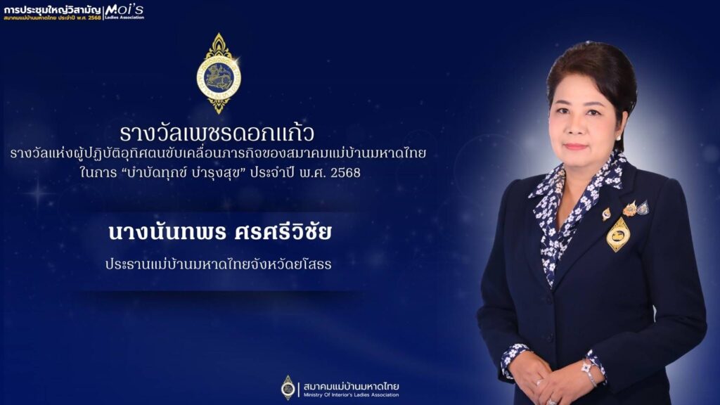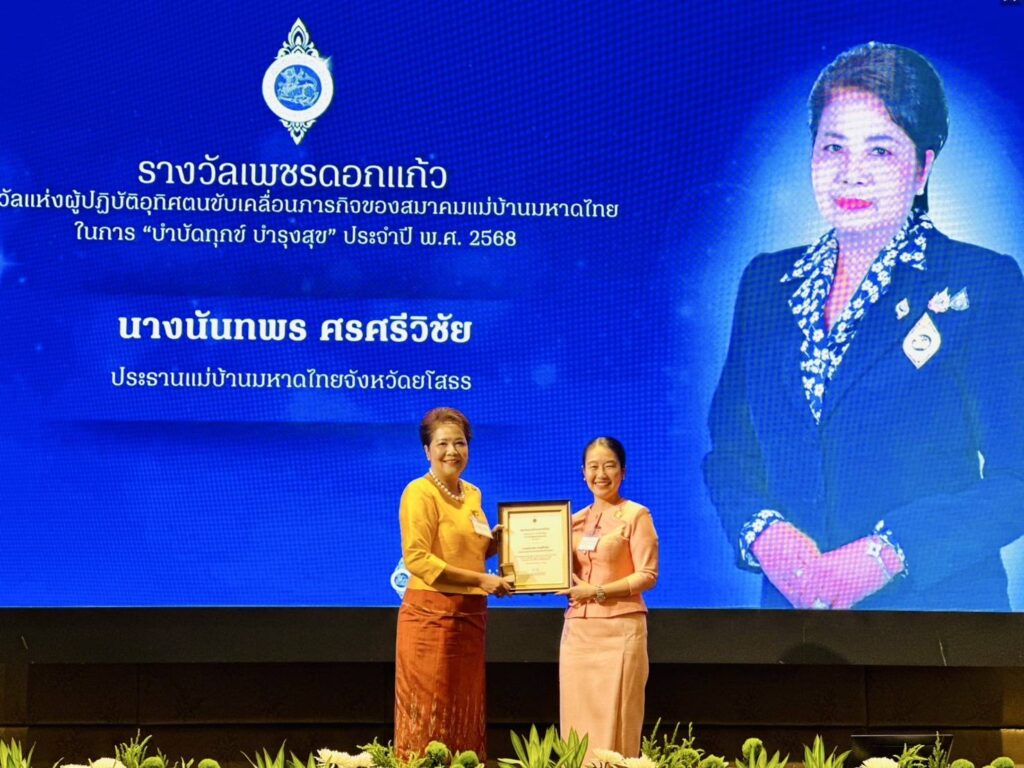 🎉ขอแสดงความยินดีเป็นอย่างยิ่ง กับ นางนันทพร ศรศรีวิชัย ประธานแม่บ้านมหาดไทยจังหวัดยโสธร ในโอกาสได้รับรางวัลอันทรงเกียรติ “เพชรดอกแก้ว” ประจำปี 2568 ในฐานะผู้อุทิศตนขับเคลื่อนภารกิจของสมาคมแม่บ้านมหาดไทยในการ “บำบัดทุกข์ บำรุงสุข” ให้แก่พี่น้องประชาชน