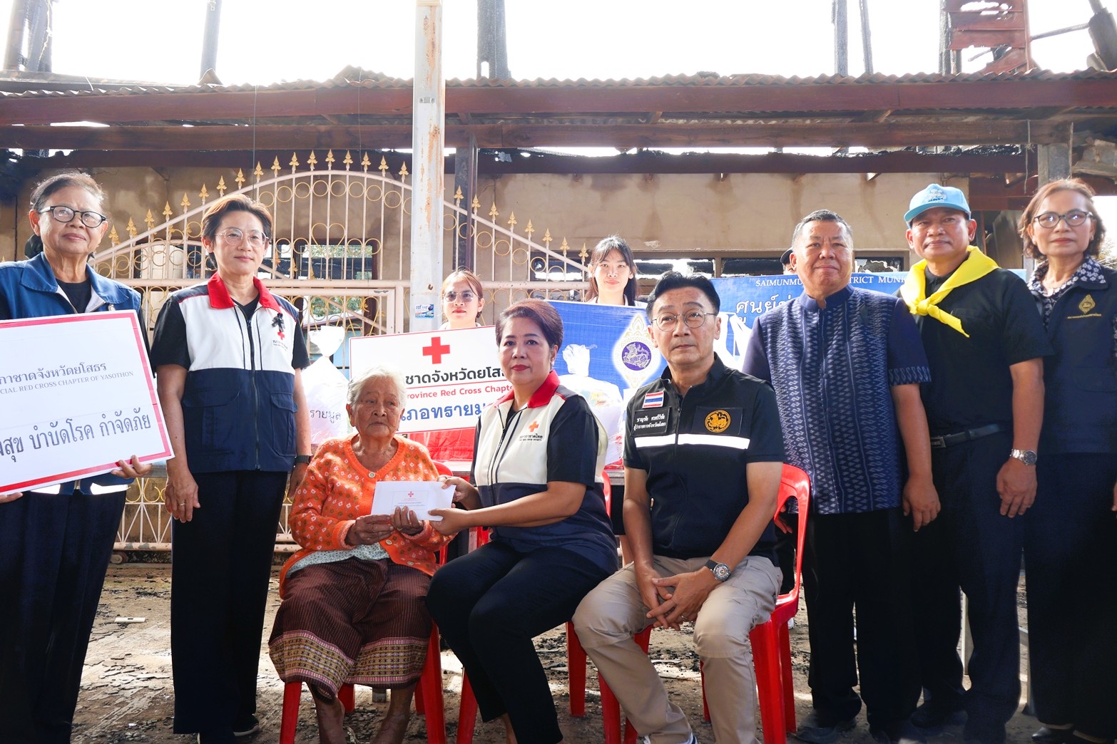 วันที่ 5 ธันวาคม 2568 ที่จังหวัดยโสธร นายชาญชัย ศรศรีวิชัย ผู้ว่าราชการจังหวัดยโสธร พร้อมด้วยนางนันทพร ศรศรีวิชัย นายกเหล่ากาชาดและประธานแม่บ้านมหาดไทยจังหวัดยโสธร พร้อมคณะหัวหน้าส่วนราชการ หน่วยงานภาครัฐ ภาคเอกชน ลงพื้นที่ หมู่ที่ 3 ตำบลทรายมูล อำเภอทรายมูล เยี่ยมให้กำลังใจชาวบ้าน พร้อมมอบสิ่งของช่วยเหลือเบื้องต้นเพื่อบรรเทาความเดือดร้อน หลังได้รับรายงานจากพื้นที่เกี่ยวกับการเกิดเหตุเพลิงไหม้บ้านประชาชนเสียหาย ช่วงเวลาประมาณเวลา 22.30 น. ของวันที่ 4 ธันวาคม 2568 ที่ผ่านมา แม้หลังรับแจ้งเหตุ นายทรงศักดิ์ มูลสาร นายกเทศมนตรีตำบลทรายมูล ได้ระดมกำลังเจ้าหน้าที่ป้องกันและบรรเทาสาธารณภัย ผนึกกำลังร่วมกับเทศบาลเมืองยโสธร, เทศบาลทุ่งแต้ และองค์การบริหารส่วนตำบลไผ่เข้าสกัดกั้นเพลิงทันทีท่ามกลางความมืด จนกระทั่งเวลา 23.30 น. จึงสามารถควบคุมสถานการณ์ไว้ได้ แม้ไม่มีผู้ได้รับบาดเจ็บหรือเสียชีวิต