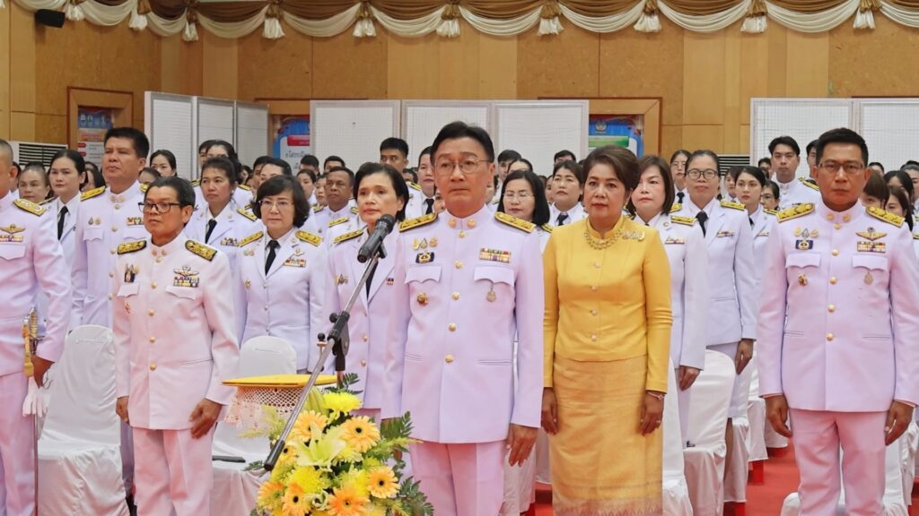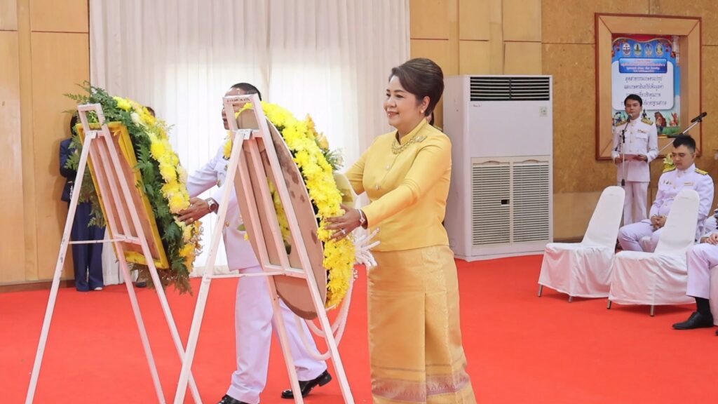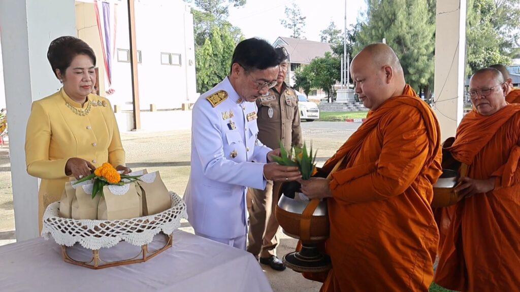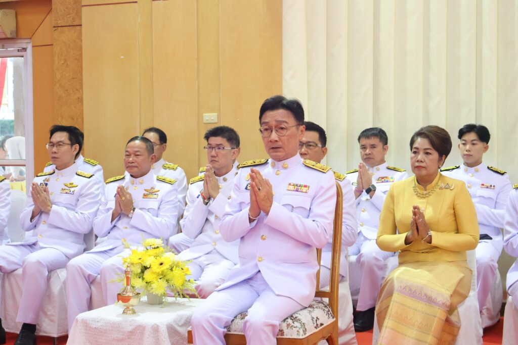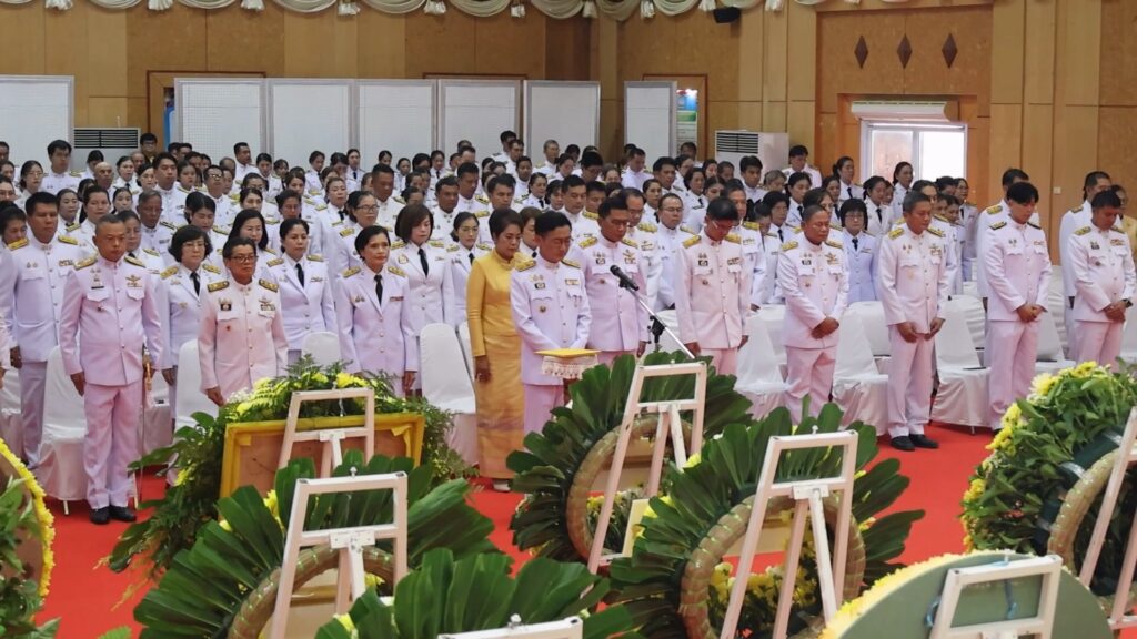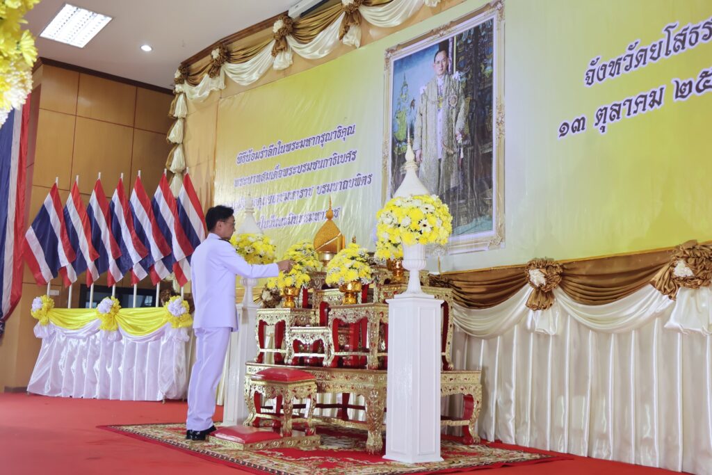 โดยในเวลา 07.30 น. ได้ร่วมกันประกอบพิธีทำบุญตักบาตรพระสงฆ์และสามเณร เพื่อถวายเป็นพระราชกุศล และต่อเนื่องด้วยพิธีวางพวงมาลาเบื้องหน้าพระบรมฉายาลักษณ์พระบาทสมเด็จพระบรมชนกาธิเบศร มหาภูมิพลอดุลยเดชมหาราช บรมนาถบพิตร ที่เริ่มจากหัวหน้าส่วนราชการหน่วยงานต่าง ๆ ประกอบพิธีวางพวงมาลา โดยมีผู้ร่วมพิธีที่พร้อมใจกันสวมชุดปกติขาวและชุดสุภาพสีเหลืองร่วมพิธีอย่างคับคั่งในโอกาสนี้ ประธานในพิธีได้กล่าวน้อมรำลึกถึงพระมหากรุณาธิคุณของพระบาทสมเด็จพระบรมชนกาธิเบศร มหาภูมิพลอดุลยเดชมหาราช บรมนาถบพิตร ความว่า พระบาทสมเด็จพระบรมชนกาธิเบศร มหาภูมิพลอดุลยเดชมหาราช บรมนาถบพิตร เสด็จพระราชสมภพเมื่อวันที่ 5 ธันวาคม พุทธศักราช 2470 ณ โรงพยาบาลเมาต์ออเบิร์น เมืองเคมบริดจ์ รัฐแมสซาชูเซตส์ สหรัฐอเมริกา และเสด็จขึ้นครองราชย์เมื่อวันที่ 9 มิถุนายน พุทธศักราช 2489 ทรงครองสิริราชสมบัติยาวนานถึง 70 ปี ตลอดระยะเวลาแห่งการครองราชย์ พระองค์ทรงอุทิศพระวรกายและพระราชหฤทัย ปฏิบัติพระราชกรณียกิจน้อยใหญ่นานัปการ เพื่อบำบัดทุกข์บำรุงสุขแก่พสกนิกรชาวไทยในทุกภูมิภาคของประเทศ ไม่ว่าจะเป็นโครงการอันเนื่องมาจากพระราชดำริ รวมกว่า 5,151 โครงการ ที่ครอบคลุมทุกด้าน ทั้งการเกษตร การชลประทาน การพัฒนาคุณภาพชีวิต การศึกษา และสาธารณสุข โดยเฉพาะอย่างยิ่งปรัชญาเศรษฐกิจพอเพียง ที่เป็นแนวทางในการดำเนินชีวิตอย่างยั่งยืนและพอประมาณ ที่พระราชทานแก่ปวงชนชาวไทย พระองค์ทรงเป็น พ่อของแผ่นดิน ที่เปี่ยมด้วยทศพิธราชธรรม ทรงเป็นศูนย์รวมดวงใจของคนไทยทั้งชาติ หลังจากนั้น ผู้เข้าร่วมพิธีทั้งหมดได้ยืนสงบนิ่งเป็นเวลา 89 วินาที เพื่อแสดงความอาลัยและน้อมสำนึกในพระมหากรุณาธิคุณอันหาที่สุดมิได้