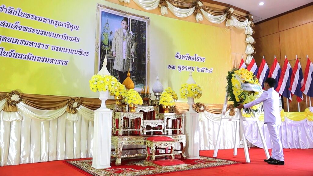 วันที่ 13 ตุลาคม 2568 ที่หอประชุมจังหวัดยโสธร ศาลากลางจังหวัดยโสธร ได้มีการจัดงานวันนวมินทรมหาราชอย่างสมพระเกียรติ เพื่อน้อมรำลึกถึงพระมหากรุณาธิคุณอันหาที่สุดมิได้ของพระบาทสมเด็จพระบรมชนกาธิเบศร มหาภูมิพลอดุลยเดชมหาราช บรมนาถบพิตร ในหลวงรัชกาลที่ 9 โดยมีนายชาญชัย ศรศรีวิชัย รองผู้ว่าราชการจังหวัดยโสธร เป็นประธานในพิธี นำนางนันทพร ศรศรีวิชัย นายกเหล่ากาชาดและประธานแม่บ้านมหาดไทยจังหวัดยโสธร นายขรรค์ไชย ทันธิมา รองผู้ว่าราชการจังหวัดยโสธร นายสันชัย พัฒนะวิชัย รองผู้ว่าราชการจังหวัดยโสธร ตลอดจนคณะหัวหน้าส่วนราชการ ศาล ทหาร ตำรวจ ข้าราชการ และพสกนิกรทุกหมู่เหล่าร่วมแสดงความจงรักภักดี